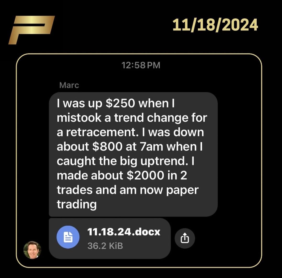 Marc makes $2,000 in 1 day after being down $800