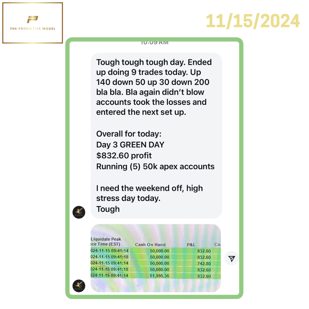 "Using The Predictive Model, I made $6,000 in ONE day! 150k funded and now closing in on a payout with an Express Account!” – Rocky